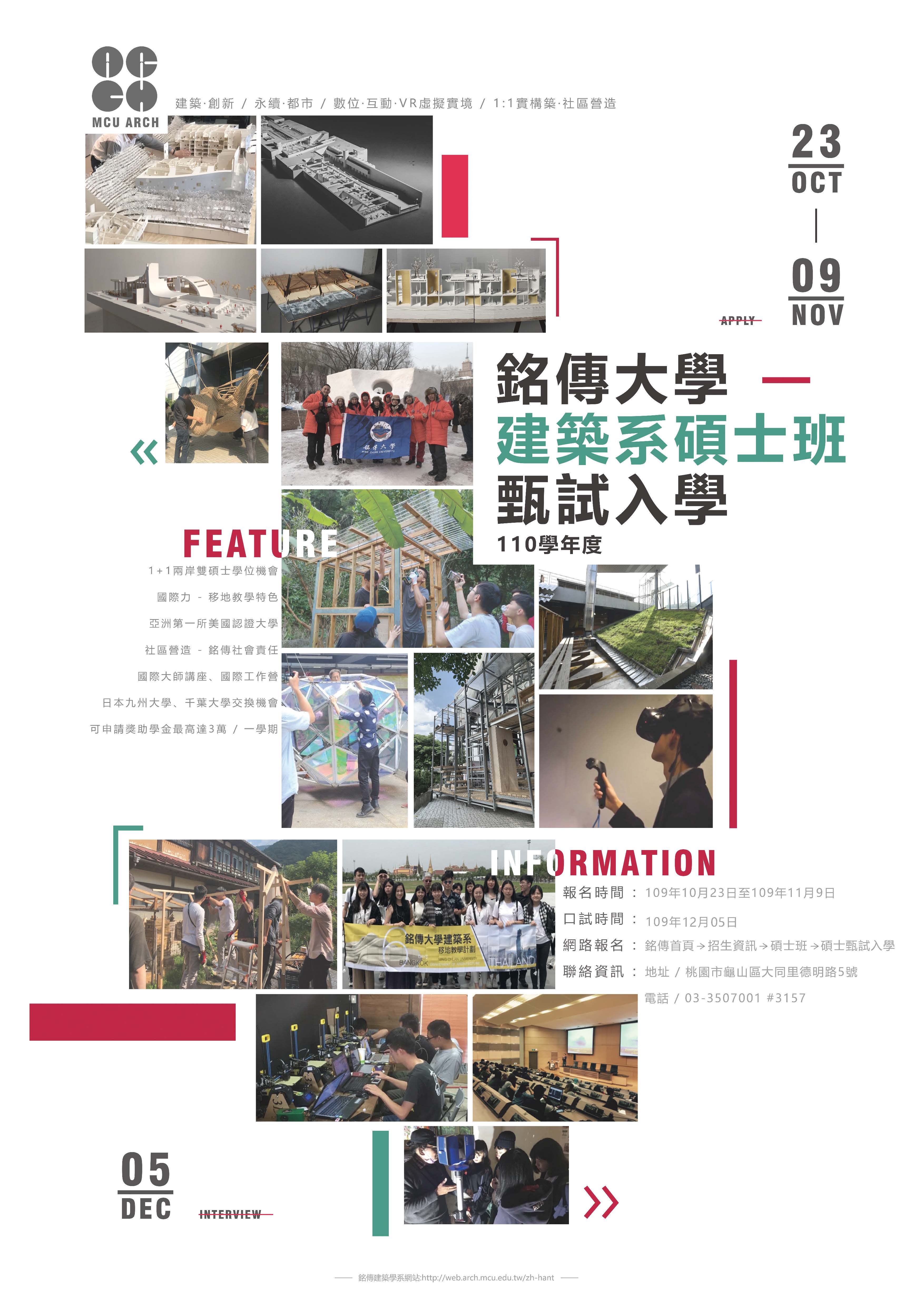 報名時間:109年10月23日-109年11月9日面試時間:109年12月5日網路報名步驟:銘傳首頁-->招生資訊-->碩士班-->碩士甄試入學歡迎大家踴躍報名!!